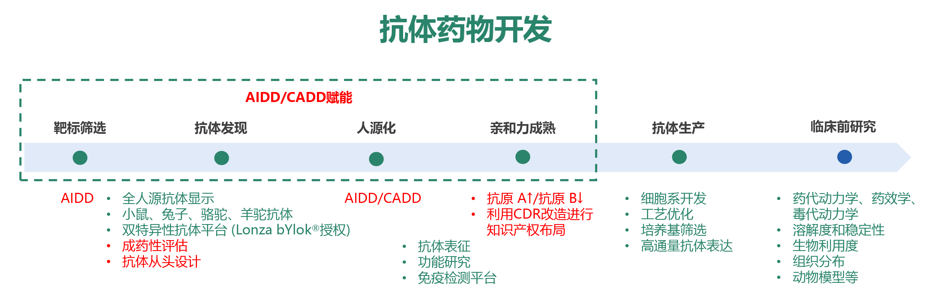 抗体药物研发服务领域,亚星游戏官网生物具备专业的技术团队,提供从靶标抗原制备到候选功能性抗体直至细胞株构建和抗体表达的一站式服务。在以结构生物学为基础,AIDD/CADD辅助的抗体发现、人源化改造、亲和力成熟等方面拥有丰硕的实践成果。利用AIDD/CADD技术,公司成功完成从抗体发现到定向亲和力改造的多个项目,其中部分项目已处在I期和II期临床试验阶段。此外,在双特异性抗体开发方面,公司的一站式药物研发平台覆盖设计、表达和纯化等多方面。同时,可通过AIDD/CADD技术赋能,进行双特异性抗体的成药性评估、亲和力成熟和专利规避等。