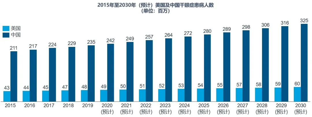 2015-2030(预计)美国及中国干眼症患病人数,资料来源:IQVIA分析
