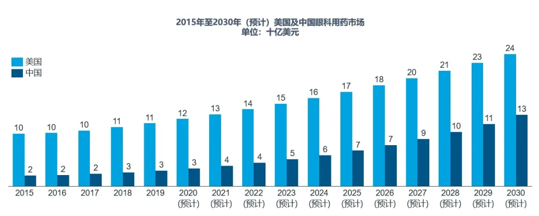 2015-2030(预计)美国及中国眼科用药市场,资料来源:IQVIA分析