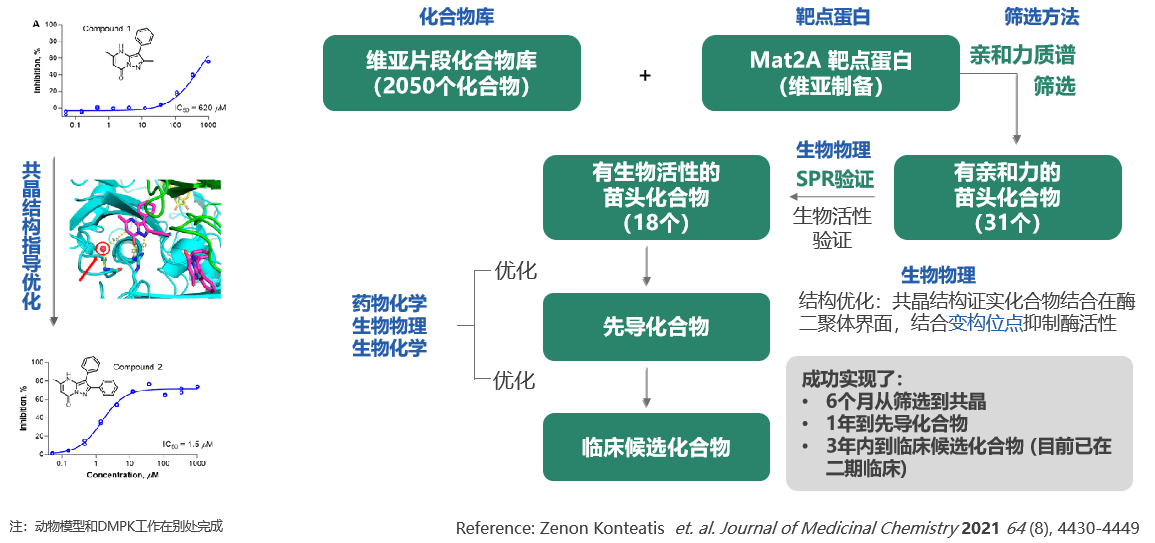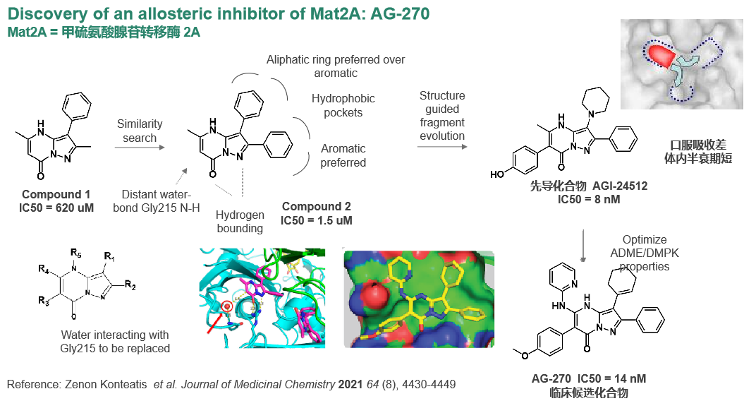 筛选获得活性片段化合物后,还需要对其进行连接及优化,以得到潜在药物分子,常用的优化策略有:片段扩展法(Growth or Evolution)和片段连接法(Linking or Merging)。在此,程学恒博士列举了一个Mat2A(甲硫氨酸腺苷转移酶 2A) 变构抑制剂的案例,其在亚星游戏官网的主导与支持下,成功完成了从片段化合物筛选到临床前候选化合物的确定。目前该案例中的研究成果已发表在Journal of Medicinal Chemistry。