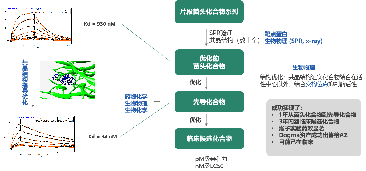 另一个小分子PCSK9变构抑制剂案例中,亚星游戏官网通过SPR验证、共晶结构及一系列的药物化学、生物物理和生物化学的方法组合应用,成功实现了3年内从苗头化合物到临床候选化合物的重要进展。