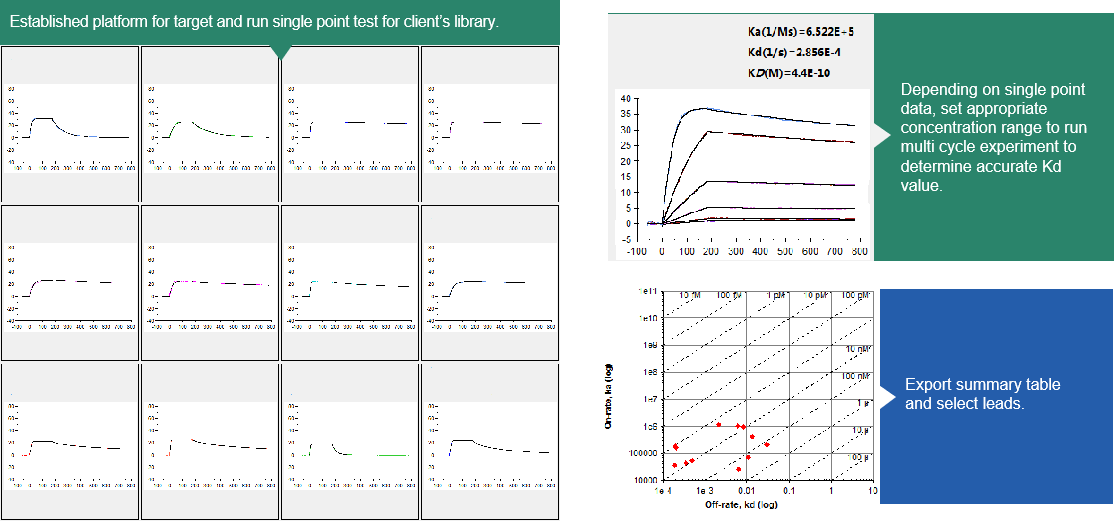SPR是基于光学现象构建的生物分子相互作用的新型生物传感分析技术,不光能测定化合物与蛋白结合,还能测定结合和解离的动力学速率,为优化化合物提供有效信息(用其他方法很难得到),大大提升了小分子药物亲和力筛选的效率。亚星游戏官网构建了稳定的Biacore 8K/Biacore S200检测平台,每天可完成超500个化合物的多浓度筛选,每年交付超100个SPR测试方法的开发,广泛应用于化合物筛选及化合物-蛋白质及蛋白-蛋白相互作用Kd的测定。