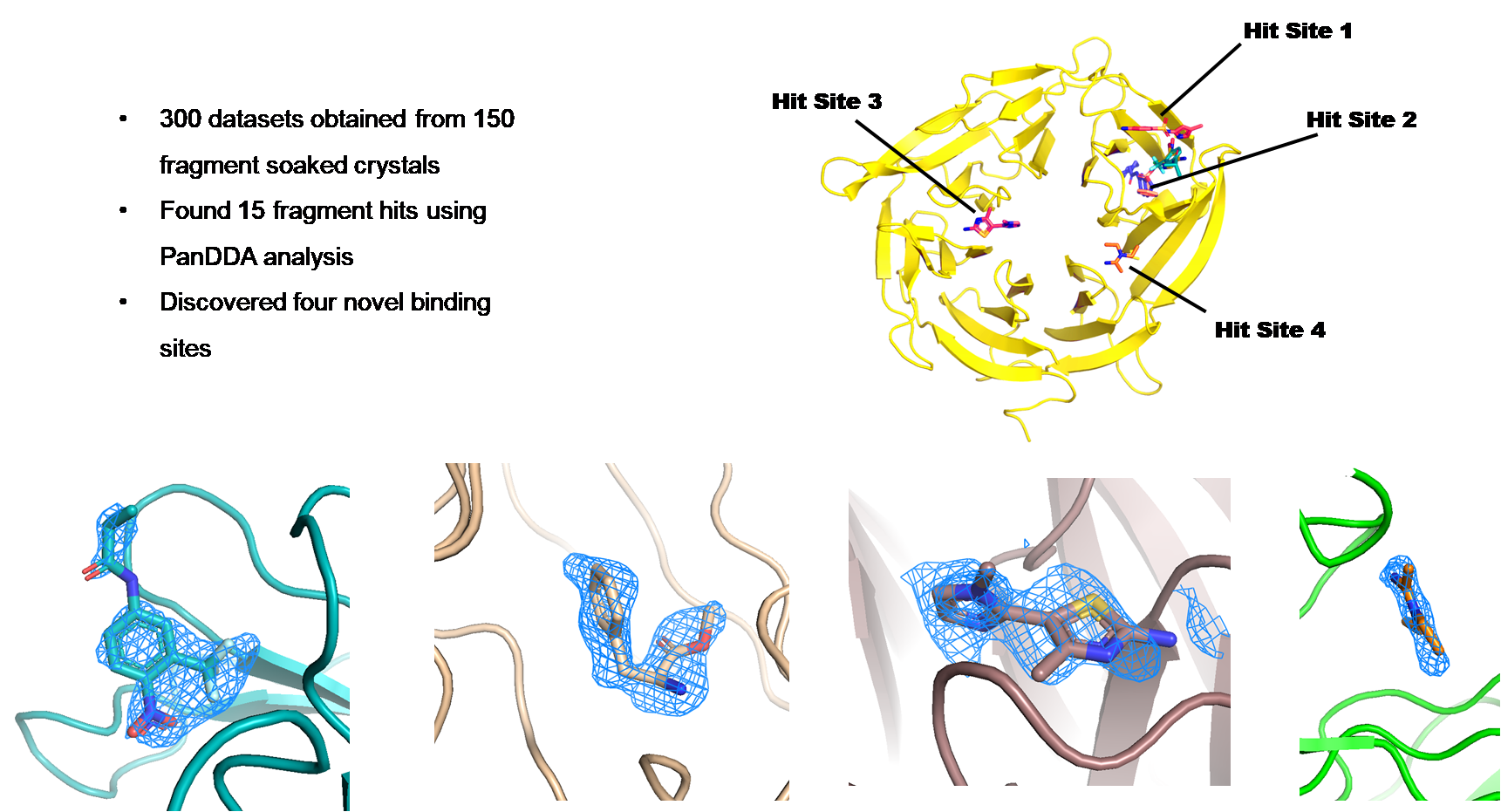 晶体浸泡法筛选(Crystal soaking),是基于片段化合物药物发现的一个重要手段。这个方法不光能测定化合物与蛋白结合,还能得到化合物和蛋白相互作用的结构信息,对优化化合物很有帮助。实验流程上,一般包括化合物准备、高通量浸泡、数据收集和结构分析等步骤。亚星游戏官网生物拥有全球规模最大的蛋白质结构研究平台,使用一流的软硬件,每年解析晶体结构高达约8000个,具有极高的成功率,最高分辨率达0.7埃。
