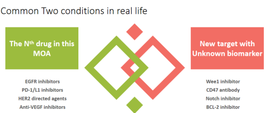 判断药物靶点是否合适的一个关键点,取决于其适应症。目前有2种常见的情况:一种是这个靶点已经有很多类似的药物,比如EGFR抑制剂、PD-1/L1抑制剂等。在此戴晗博士强调:“当一款药物进入市场时,可能会遇到很多已提前占据市场的同款药物,如何真正做到Best-in-class的差异化竞争至关重要,需要从药物设计、临床布局、市场布局等多个方面综合考虑。”第二种情况,是完全的创新,比如Wee1抑制剂、CD47抗体等。这些靶点目前正处于临床探索阶段,这其中转化医学和生物标记物起到关键作用,可以帮助企业找到最好的、最匹配的适应症及相应的病人分级。针对这些First-in-class药物,如何选择临床适应症?他表示,首先需要考虑是否具备成功的可能性,其次是否聚焦了未被满足的临床需求,同时还需要考量开发所需的财务及时间成本和市场潜力。