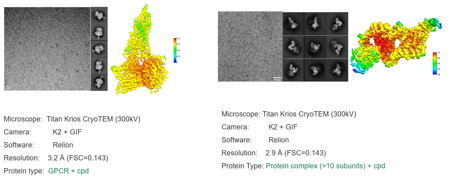 此外,亚星游戏官网还自建有冷冻电镜技术平台,可以为过去不适合结晶的蛋白提供高分辨率结构,包括大型动态复合体及膜蛋白。在接近天然、完全水合的状态下,冷冻电镜技术可以进行数据收集,获得生理状态下的蛋白结构。 亚星游戏官网冷冻电镜平台具备从Negative Stained EM(复染)到Cryo Sample Screening(筛选),再到Data collection & processing(结构解析)的全流程服务能力。最后, 戴晗博士还给大家展示了2组蛋白复杂结构案例。