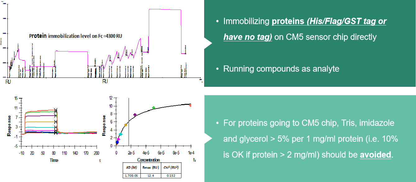 将蛋白固定在CM5芯片表面,小分子作为流动相,测定不同浓度的小分子与蛋白结合与解离情况。操作过程中,首先需要对蛋白进行pH4.0醋酸钠溶液浸泡处理,然后再经过脱水缩合与CM5芯片表面的羧基形成肽键,这可能会导致蛋白质的活性减弱甚至破坏蛋白质的结构,所以在实验中通常不建议直接使用蛋白质与CM5芯片进行偶联。
