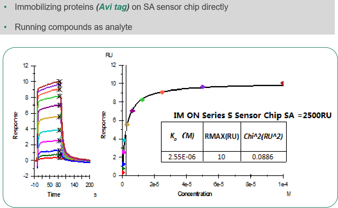 作为检测亲和力的首选方法,采用SA芯片捕获蛋白,小分子作为流动相,不需要对蛋白进行醋酸钠溶液浸泡,避免了对蛋白质的损坏。在早期蛋白设计环节,将目标蛋白加上Avi-Tag标签,完成蛋白纯化后再进行生物素化处理。