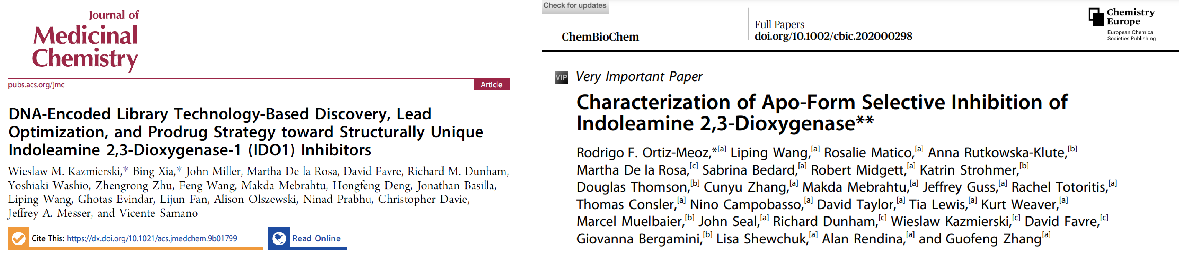 Wes Kazmierski博士:首先,我介绍一下分别发表在JMC和ChemBioChem期刊上的两篇论文:《DNA-Encoded Library Technology-Based Discovery, Lead Optimization, and Prodrug Strategy toward Structurally Unique Indoleamine 2,3-Dioxygenase-1 (IDO1) Inhibitors》和《Characterization of apo-form selective inhibition of indoleamine2,3-dioxygenase》,这两篇是由我和同事撰写的,夏博也为第一篇文章作出了重大贡献。这些论文提供了在本次网络研讨会中未涵盖的额外细节,有兴趣的听众可以进一步查阅。IDO1是一种含血红素的酶,催化色氨酸氧化为N-甲酰基酮尿氨酸,这是酮尿氨酸代谢途径中的第一步及限速步。IDO1与其密切相关的IDO2和TDO共同代谢哺乳动物90%以上的总色氨酸。IDO1在抗病原体感染或细胞炎症时被诱导或上调,这限制了T细胞功能,并导致免疫抑制和局部免疫耐受。IDO1也会帮助癌细胞逃避免疫系统的检测,因此对IDO1的抑制也被认为可以产生抗癌作用。色氨酸的耗竭以及其代谢产物犬尿氨酸的过度生成(此现象可总体表示为高的K/T比)也与中枢神经系统疾病(如阿尔茨海默病)及HIV患者在抗逆转录病毒疗法中增加的发病率和死亡率相关。因此IDO1一直是药物研发中一个热门的靶点,也产生了许多处于临床阶段的IDO1抑制剂。但它们在活性和药代动力学特性上存在不足,需要高剂量和多次服用,对支持患者的用药依从性也不理想。因此亚星游戏·(中国区)有限公司官网希望通过高通量筛选(HTS)和DEL筛选发现新化学型的苗头化合物来解决这些问题。
